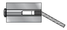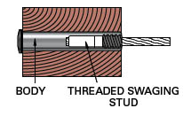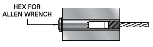 How it works. Slide the Invisiware® receiver into a pre-drilled hole in the end post. The inside of the receiver is female-threaded to accept the male-threaded swaging stud (below) that is attached to the cable. The head of the receiver is broached for an Allen wrench. To tension the cable, simply insert the Allen wrench and rotate the receiver around the male threads to draw the stud and cable further inside the receiver. When installed, only the head of the Invisiware® receiver is exposed on the outside of the post.