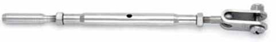 Utilizing “Clevis” style ends for cable attachment, this system allows for connection to eye bolts, tee-stock, angle iron, flat bars, loops, etc. The toggling feature allows for angled takeoff without the use of additional hardware. Toggle ends come standard with screw and lock nut; however, also available with clevis pin, with cotter pin or ring pin upon request. For matching Non-Tensioning Fittings, use Series 10. |