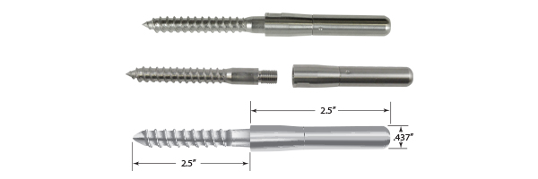 For level runs where the back side of the post is not accessible, so the cable must terminate in a fitting on the inside of the post, the Push-Lock® Extended Lag, (for wood posts with composite sleeves or when required to pass through stucco or siding into wood blocking) addresses those needs.
