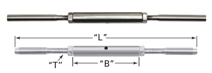 The Swage to Swage Turnbuckles are applied in longer cable runs with spacing approximately 30?-40? ensuring that proper tensioning of a cable assembly can be achieved. Additionally, these assemblies can be positioned to achieve a certain desired look in shorter cable runs. These fittings are fully compatible with any of our termination style fittings. An additional fitting is required on both ends of the cable to complete the assembly.