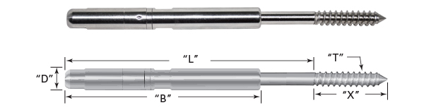 The Push-Lock® Tensioner with Hanger Bolt can be used with any fitting on the opposite end of the run. This fitting consists of two separate pieces: the hanger bolt and Push-Lock® tensioning body. The hanger bolt is driven into a pre-drilled hole in face of the wood end post. The cable attaches to the body via the Push-Lock® locking wedge system which requires no special tools. The machine thread of the hanger bolt threads into the body, connecting the two pieces. Tension is created by securing the post-side segment of the body onto the machine threads while preventing the cable-side segment of the body from turning. The Push-Lock® Tensioner with Hanger Bolt can be used with sleeved posts as well.