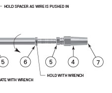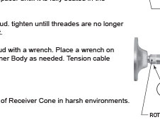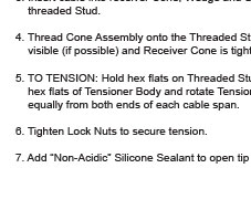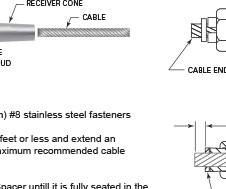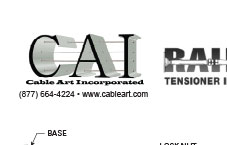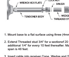 Patented tensioner is used for cable railing applications. Slotted base allows for angles up to 45 degrees and is used at either end of cable runs. Compression fitting allows for tensioning with simple hand tools. Round shaped base is designed for use with 2" stainless tubing and stays fixed while allowing the body to rotate during tensioning of cable. Requires rivets to attach to tubing.