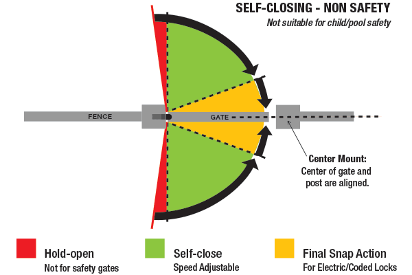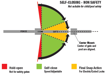 SureClose 108SF is suitable for pool and safety gates. SF models open to and self-close from 90°.* NO hold-open feature.