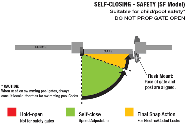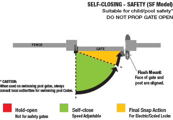 SureClose 108SF is suitable for pool and safety gates. SF models open to and self-close from 90°.* NO hold-open feature.