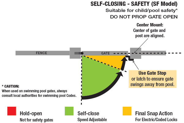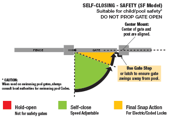 SureClose 108SF is suitable for pool and safety gates. SF models open to and self-close from 90°.* NO hold-open feature.
