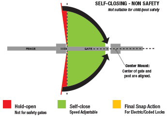 SureClose 57SF is suitable for pool and safety gates. SF models open to and self-close from 90°.* NO hold-open feature.