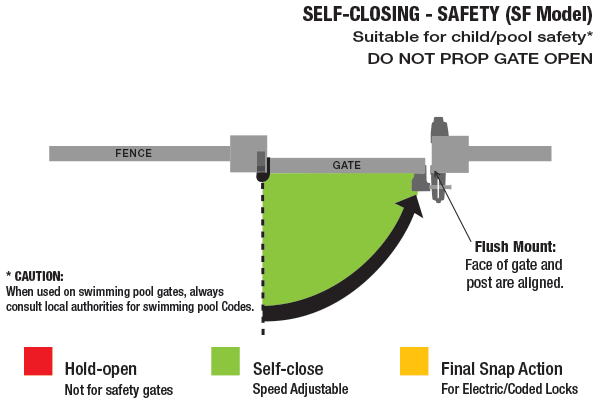 SureClose 57SF is suitable for pool and safety gates. SF models open to and self-close from 90°.* NO hold-open feature.
