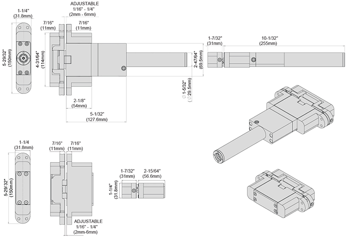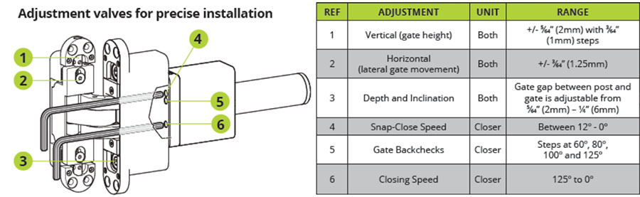 Soft, quiet closure protects the gate’s latching/locking system. 'Closing Speed', 'Final Snap-Close' and ‘Backcheck' are adjustable using a simple Allen key. The hinge-closer is easily adjustable in three dimensions (horizontal, vertical and in/out) for fine positioning and speedy gate alignment.